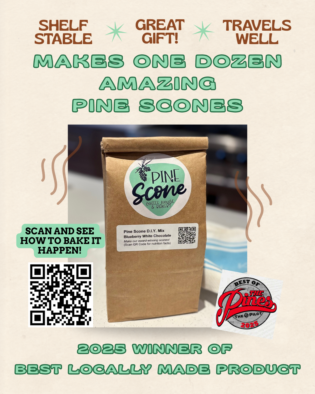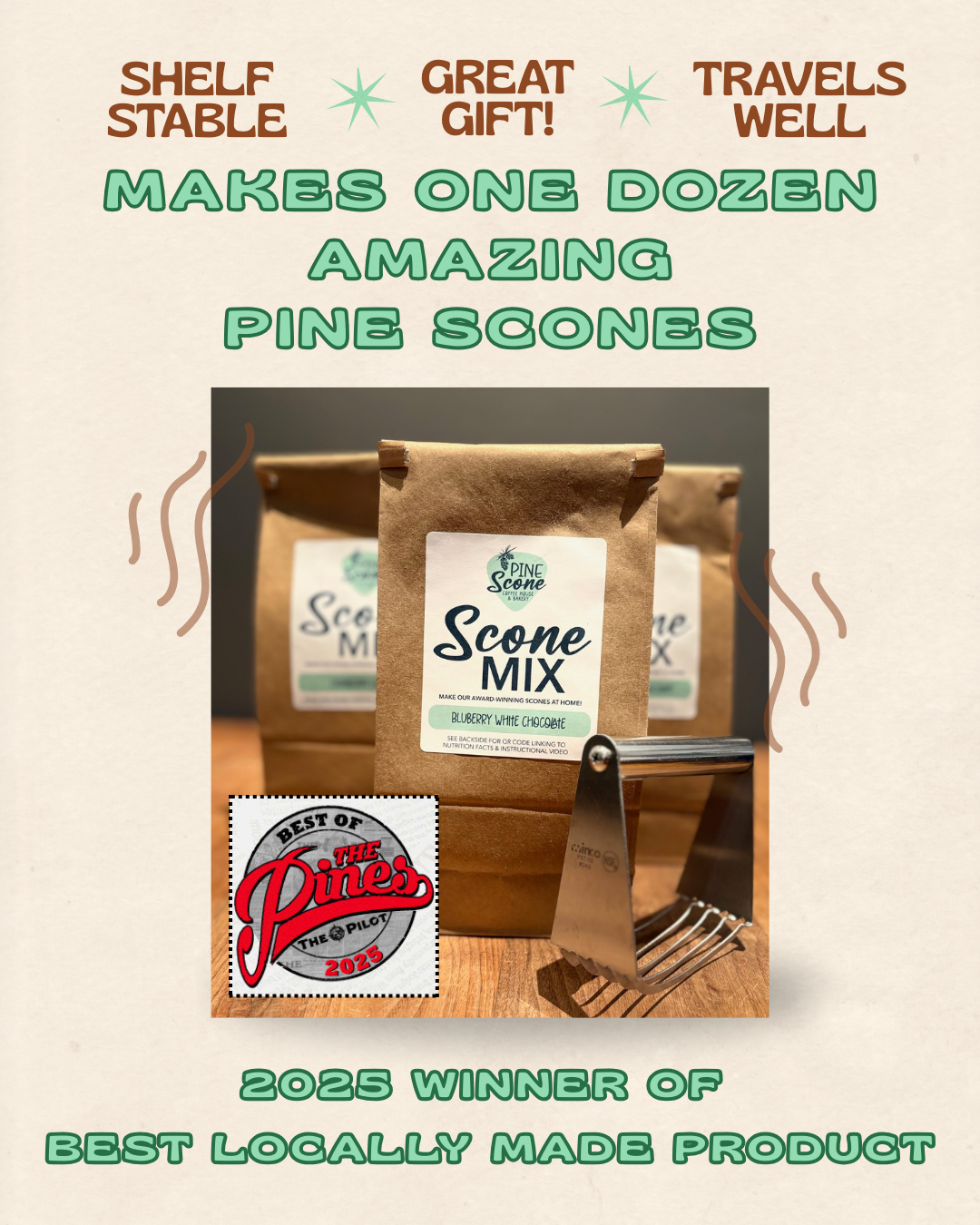 Shelf stable scone mixes you can take and make anywhere! They travel well and can be shipped. Each mix makes a dozen of our amazing, award winning Pine Scones! (Not included: butter, heavy cream, buttermilk)